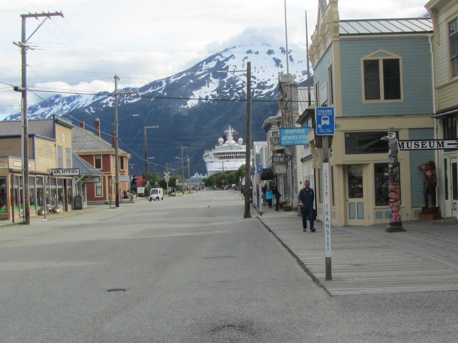 Finally we arrived in the bustling town of Skagway. It was full of jewelry shops, T-shirt/souvenir shops and looming over all were the cruise ships in the harbour.